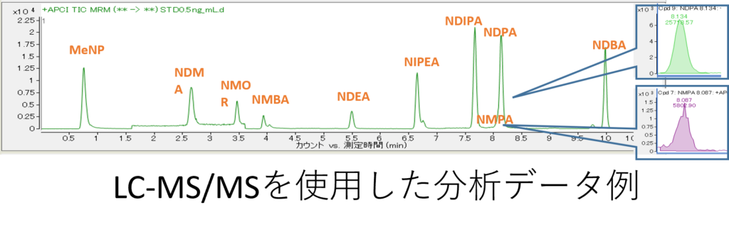 ニトロソアミン類11種類(NDMA、NDEA、NMBA、NMPA、NIPEA、NDIPA、MeNP、NDBA、NMOR、DPNA、MNU)について、当社では事前に回収率、再現性、保存性などを確認したうえでの精度の高い測定を行っています。